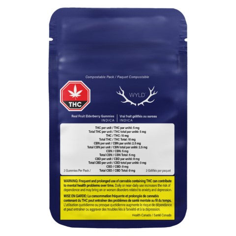 RL FRT Elderberry CBN Gummies. Wyld Elderberry Indica Enhanced THC:CBN gummies are a 2:1 product featuring a balanced dose of CBN. Made sustainably with real fruit, botanical terpenes, natural flavours, and compostable packaging. 5mg THC and 2.5mg CBN per gummy, with two gummies per pack for a total of 10mg THC and 5mg CBN.
